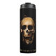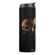 Tres cráneos humanos contra el fondo negro, un pequeño criador mirando sobre el cráneo medio
