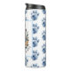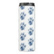 El gato romano de color canalino gris rosado rodeado de flores rosadas y azules. Antecedentes las huellas de la pata de gato color agua azul.