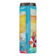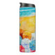 Olas en una playa de arena, surfista y bañeras de sol bajo sombrillas de colores, este tumbler termal personalizado muestra tu nombre en la parte delantera y en la parte trasera, cualquier mensaje en la franja turquesa - mostramos "¡QUÉDATE GUAY! PUEDE CONTENER ALGO MÁS QUE AGUA". Diversión para el verano, vacaciones o regalo como regalo.