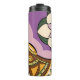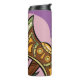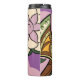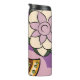 This artwork features a stylized axe and a flower, each rendered in a flat, geometric style with bold outlines. The axe has an ornate design with a brown handle and a yellow and brown head, decorated with circles and lines. The flower has light purple petals and a yellow center, with a few green leaves. The background is a solid purple color, and the axe and flower are placed asymmetrically. The overall design is decorative and eye-catching, combining elements of nature (the flower) and human craft (the axe) in a stylized and somewhat abstract manner. The contrast between the sharp, angular axe and the soft, rounded flower creates visual interest.