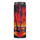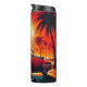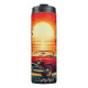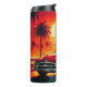 Este elegante ilustracion cuenta con un clásico aparcamiento rojo convertible en una carretera al atardecer. El gran sol vibrante se asoma al océano, con una luz que se refleja en el agua. Las palmeras se encuentran frente al cálido cielo rojo naranja, creando una escena nostálgica y retro que recuerda a un poster de viajes vintage.