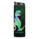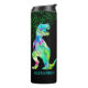 Un divertido dinosaurio colorido T-Rex nombre personalizado tumbler térmico para el niño que ama los dinosaurios. Ilustracion de dino prehistórico Tyrannosaurus rex como nunca antes lo había visto en colores vivos brillantes con follaje de jungla Jurásica en un fondo negro. La botella de agua personalizada perfecta para la escuela con ilustracion acuarela tirannosauro psicodélico pintado con tonos púrpura, rosa, aqua, azul, naranja y verde que le dan un diseño prehistórico multicolor vibrante. que se distingue de la multitud con una plantilla de nombre fácil de usar. Obra de arte original y lema gracioso creado por la artista Catherine Sweetman