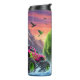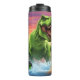 A colossal green T-Rex with a wide-open, roaring mouth stands amidst a dramatic water splash, flanked by vibrant pink and blue monster trucks. Birds fly across a mountainous background under a dynamic sky, creating an exciting and action-filled prehistoric and modern vehicle clash.