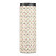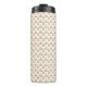 Tall travel mug with a black lid featuring a repeated pattern of small, colorful floral motifs on a cream background. Displayed front and rotated right.