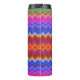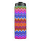 Tall travel mug with a vibrant zigzag pattern featuring shades of pink, blue, orange, and brown. It has a black lid, creating a lively, energetic feel.