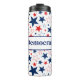 Este tumbler térmico se muestra con una estampación de estrellas patrióticas y texto demócrata. personalizar este artículo o compra tal cual.