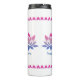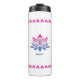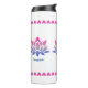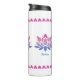 Este tumbler termal tiene tres flores de loto de color azul-rosa con texto editable para promover una pausa meditativa de las bebidas. Los tres elementos de texto para que usted los edite son: "AGRADECIMIENTO" "FELIZ" y "ALEGRÍA". Alrededor de la parte superior hay un patrón que hace eco del pétalo rosa brillante de la flor de loto de abajo. Esto se repite alrededor del fondo del tumbler.