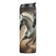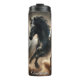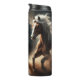 Three powerful horses, one white, one black, and one brown, gallop fiercely through a dusty terrain. Their manes and tails fly wildly, conveying a sense of raw energy, freedom, and the untamed spirit of the wild.