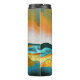Escena paisajística abstracta de una vista montañosa con colinas ondulantes y una tormenta en naranja, oro, azul y cian.