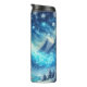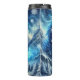 Un poderoso dragón blanco y azul helado con intrincados patrones de agitación está encaramado en un paisaje montañoso y nevado. El dragón está exhalando una ráfaga de helada energía y nieve, mientras los copos de nieve caen del cielo oscuro y turbio iluminado por una luz distante.