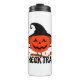 Celebra Halloween de manera espeluznante con esta obra de arte de la Trata de Calabaza con una calabaza super linda con un hacha de daga y un fantasma. La obra de arte lleva un gorra, añadiendo un aspecto de misterio a la figura fantasmal.