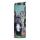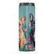 Este ilustracion gráfico presenta a tres felices Bulldoges franceses de diferentes colores (negro y blanco, romano y francés) sentados en un campo de flores de colores. Los perros tienen grandes ojos expresivos y miran directamente al espectador. El fondo es un azul suave con moqueta blanca y el conjunto es alegre y alegre.