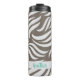 Take your hot or cold beverages anywhere with this beachy, chic and modern thermal tumbler. This travel mug features a simple truffle brown and cream foliage print pattern. Personalize your name or message in turquoise colored script typography. These stylish thermal tumblers make perfect customized gifts for your best friends, sister, Mom or any other special person in your life. Or better yet, get one for yourself! When customizing the name or custom message on the tumbler, ensure it fits nicely within the space provided.