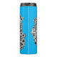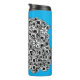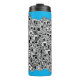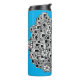 Tumbler termal negro y blanco con fondo azul. Diseño original de Michelle Andrade.