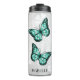 Disfrute de cualquier bebida mientras está en viaje con un Verde azulado Tumbler Termal Personalizado con Flor de Mariposa. El diseño del Tumbler presenta un par de mariposas vibrantes que descansan sobre una vina floral blanca sobre un fondo gris claro. Artículos de regalo adicionales disponibles con este diseño así como una variedad de colores.