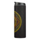 Esta mandala fue diseñada para el signo del zodiaco, Escorpio, que representa una piedra rubí en el centro rodeada de elementos que representan el signo, como el símbolo del signo, la constelación y el símbolo alquímico del agua, así como las viñas y tejas de filigree que la envuelven en una imagen sólida en tonos rojos, dorados y negros.