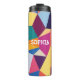 Este tumbler térmico presenta un diseño abstracto, audaz y colorido, de formas geométricas. Personalizar tu diseño añadiendo fácilmente un nombre, que se muestra en blanco.