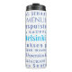 Los principales monumentos, parques e islas de Helsinki, la capital de Finlandia, y un bien guardado destino de vacaciones secreto. Tipografía en azul y oscuro, así como en azul y blanco de la bandera finlandesa. ¡Grandes recuerdos mientras tomas tu bebida caliente favorita!