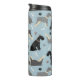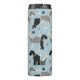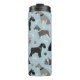 Perros Schnauzer en negro, sal, pimienta y abrigos negros y plateados sentados, de pie y girando con huesos de perro dispersos y huellas de pata en un fondo azul claro.