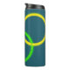 Tres círculos interconectados en azul, amarillo y verde. El patrón se muestra dos veces, una vez centrado y la segunda vez con la brecha en la parte posterior. El fondo es un verde oscuro.