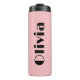 Tumblador térmico simple de color rosa y negro con tu nombre en un divertido texto retro. Totalmente editable, incluyendo el color base del tumbler, y la redacción del texto, color, tamaño y estilo. Seleccione "Personalizar esta plantilla" y realice los cambios deseados, o puede ordenar este tumbler tal como está. Se muestra el nombre, Olivia, en texto retro negro sobre un vaso de agua rosado con tapa negra. Un tumbler personalizado hace un regalo maravilloso para las damas de honor, las novias, los huéspedes del fin de semana, la reunión familiar o para una noche de chica. De 369MyName.