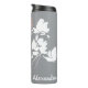 Color de agua colorido moderno y flores y hojas de tinta sobre fondo gris moderno, tambor termal. Características, espacio de plantilla único en script blanco para nombre o iniciales.