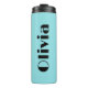 Sencillo tumbler termal minimalista y elegante de color turquesa y negro con tu nombre en un divertido texto retro. Totalmente editable, incluyendo el color base del tumbler, y la redacción del texto, color, tamaño y estilo. Seleccione "Personalizar esta plantilla" y realice los cambios deseados, o puede ordenar este tumbler "tal cual". Se muestra el nombre, Olivia, en texto retro negro sobre un tumbler fresco de color turquesa con tapa negra. De 369MyName.