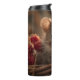 A captivating and highly detailed macro close-up portrait of a tiny, adorable mouse or harvest mouse, captured at eye-level as it peers inquisitively out of a rustic wicker basket. The mouse's large black eyes and long whiskers are the central focus. Clusters of bright red berries (like raspberries) rest beside it, suggesting an autumn harvest theme. The blurred, warm bokeh background of dry grasses enhances the cottagecore aesthetic and the charm of this tiny wildlife subject.