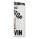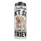 Este encantador ilustracion gráfico presenta un alegre y feliz cachorro con la lengua fuera, parado entre el texto "NO DETENGAS" en la parte superior y "RETRIEVIN" en la parte inferior. A la izquierda hay un rastro de huellas de pata rosa. El arte tiene un aire divertido, caprichoso y amoroso, celebrando el espíritu enérgico de un mascota.