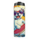 Este elegante ilustracion cuenta con un perro feliz con gafas de sol surfeando en una tabla roja. Una gran ola se estrelló detrás de ella bajo un sol brillante y sonriente. El arte tiene un ambiente vibrante, atrevido y enérgico, con un tono lúdico y una estética retro clásica.
