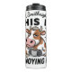 Este gracioso ilustracion cuenta con una vaca de aspecto gruñón con una taza de café. La vaca tiene una expresión descontenta y los papeles vuelan alrededor de su cabeza, lo que sugiere un ambiente de trabajo estresante. Las palabras "ESTO ME ESTÁ ANNOTANDO" están en la parte superior y inferior del arte, dándole una sensación de humor y relación.