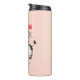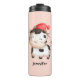 Botella de agua con una adorable imagen de una vaca manchada de blanco y negro con un gorra rojo.