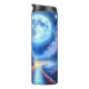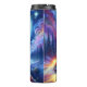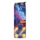 Esta imagen muestra un vibrante semicírculo rojo con brillantes faros que conducen por una autopista bajo una gran luna llena de luz. El cielo nocturno está lleno de nubes agitadas y coloridas en tonos violeta, azul y rojo, junto con estrellas brillantes. Pinos bordean la carretera, y la carretera refleja la luz de la luna, creando un viaje fantástico y soñador.