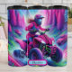 Un piloto ATV vibrante y estilizado, vestido con un engranaje rosa y azul a juego, navega por un surrealista camino fuera de carretera. Todo el paisaje rebosa de deslumbrantes tonos de rosa, púrpura, azul y verde, transformando el bosque y las montañas en un paisaje psicodélico de ensueño. Otros vehículos son ligeramente visibles, lo que añade profundidad a esta escena de aventura enérgica y de colores fantásticos.
