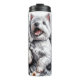 Una encantadora representación de un Territorio de la Montaña Occidental con una expresión alegre, enclavado entre girasoles monocromáticos y peonías sutilmente tintadas. La paleta de colores, limitada, hace hincapié en la energía del perro en un entorno floral elegante, que atrae a admiradores de Westie y del arte.