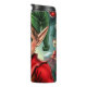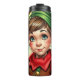 A sweet Christmas water bottle with a cute elf cartoon and a festive background.