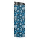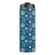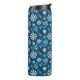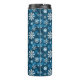 Destei's decorative white snowflake pattern over an abstract blue background.