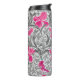 Tumbler en un William Morris, Art Nouveau, imprenta textil de iris y hojas, realzada digitalmente y coloreada, en fucsia y rosa claro, con grafito y hojas grises y medias, sobre un fondo gris plateado claro
