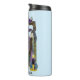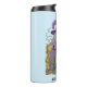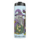 Un mago todo en púrpura sosteniendo un equipo que tiene una bola de cristal morado. Un pequeño dragón verde, nudo celta trabajando, vela y un borde de otoño deja todo en un fondo azul claro