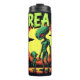Este ilustracion dinámico muestra dos alienígenas verdes bajo los platillos voladores descendentes con vigas brillantes, colocados sobre un naranja llamativo y fondo amarillo. El texto grande y estilizado "AREA 51" evoca inmediatamente temas de encuentros secretos con extranjeros.