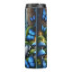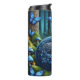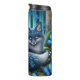 Esta imagen mística muestra un hermoso zorro azul con ojos azules brillantes, enrollado en un bosque de fantasía. El cuerpo y la cola del zorro están adornados con complejos patrones de hojas. Está rodeada de grandes mariposas azules, suelo cubierto de musgo y champiñones resplandecientes, todo ello rodeado de árboles altos y estilizados.