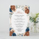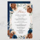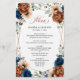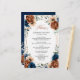 Elegante menú de boda con tema floral de azul marino, terracota y tierra naranja que presenta un elegante ramo de rosas peonías de color azul marino y terracota y hojas de eucalipto verdes. Por favor, contácteme para cualquier ayuda en personalización o si necesita algún otro producto con este diseño.