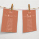 In the upper part, there is the table number written in a handwriting script and the word Table above, in smaller caps (hand letters). Under them, there are the 10 guest names, in similar hand letters. The background is terracotta (a modern shade of brown), all text is white.