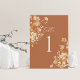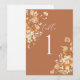 Warm terracotta background table numbers featuring elegant watercolor florals in soft burnt orange, beige, and ivory tones.