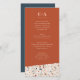 Un detalle de piedra de terrazo de tendencia y una tipografía inspirada en el siglo XX dan a este menú boda un aspecto sin florituras, una atmósfera de moda en una paleta de colores inspirada en el desierto, el óxido, el azul verdoso y la pizarra, todo ello coronado por un monograma moderno.