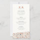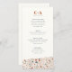 Un detalle de piedra de terrazo de tendencia y una tipografía inspirada en el siglo XX dan a este menú boda un aspecto sin florituras, una atmósfera de moda en una paleta de colores inspirada en el desierto, el óxido, el azul verdoso y la pizarra, todo ello coronado por un monograma moderno.