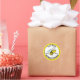 Una abeja alegre está en el centro de esta etiqueta de tarro de miel. Puede editar el texto para crear el mensaje personalizado. El texto de la pantalla dice 'Fresh Honey NET WT. 16 OZ. DE Añadir el nombre de la granja aquí. El pegatina es redondo. La abeja está dentro de un círculo blanco que tiene un borde negro y amarillo. El texto es negro.