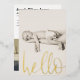 Esta es una plantilla moderna y minimalista de invitación para bebés. En el frente hay espacio para tu foto de retrato de tamaño completo favorita con una tipografía asombrosamente simple "hola" editable en caligrafía de Relieve metalizado de oro real . Al revés hay espacio para una foto horizontal, el nombre y las estadísticas del recién nacido junto con un mensaje personal. Personalizar con facilidad por ese singular conservador para que la familia y los amigos disfruten en los años venideros.