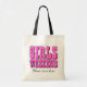 Los chicas weekend el texto personalizado el | de la bolsa de asas del fiesta para el destino o el tema. Lindo para las novias, la noche de los chicas hacia fuera, la reunión para mujer de la reunión, el viaje de las vacaciones de las señoras o el fiesta del bachelorette para casar novias y a damas de honor. Texto adaptable elegante. Color rosado y negro.