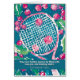 La tarjeta de Navidades de tenis de época presenta un diseño encantador con una raqueta de tenis en el centro, rodeada de pelotas rojas de tenis que recuerdan a los adornos navideños. El fondo es de un azul oscuro festivo, adornado con hojas y bayas huecas, lo que añade un toque tradicional vacacional. El texto principal dice: "¡Que tu temporada de vacaciones esté llena de amor, alegría y tiros ganadores!" seguido de "¡de [tus nombres] Familia", indicando que tanto el texto frontal como el interno se pueden personalizar para agregar un toque personal. 🎾 🎄